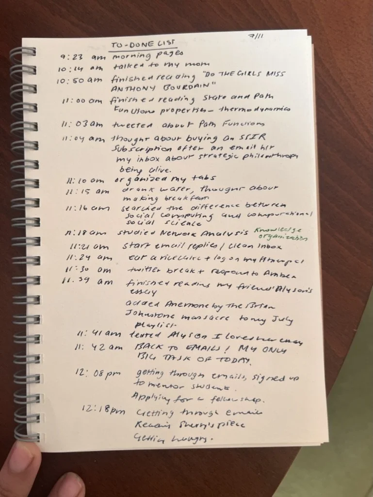 below is my to-done list from thursday, 7/11/24. i try not to keep a rigid ‘to-do’ list for the day anymore as it tends to stress me out. these days i will set a theme for the week or the day, and try to have enough self-trust in my subconscious that if i continue to do what i want, i will be okay. i do have a mega-list in my notebook that i add to when a to-do, an intention, or an idea that i cannot do right in that moment comes up.